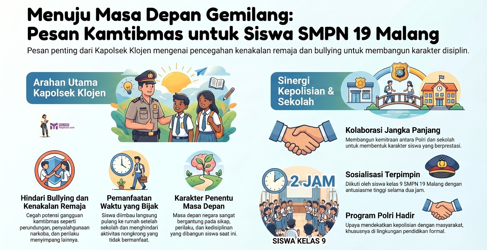 Dengan pendekatan edukatif dan humanis, Polsek Klojen terus berkomitmen hadir di tengah generasi muda untuk membangun sinergi positif antara keamanan, pendidikan, dan pembentukan karakter bangsa.