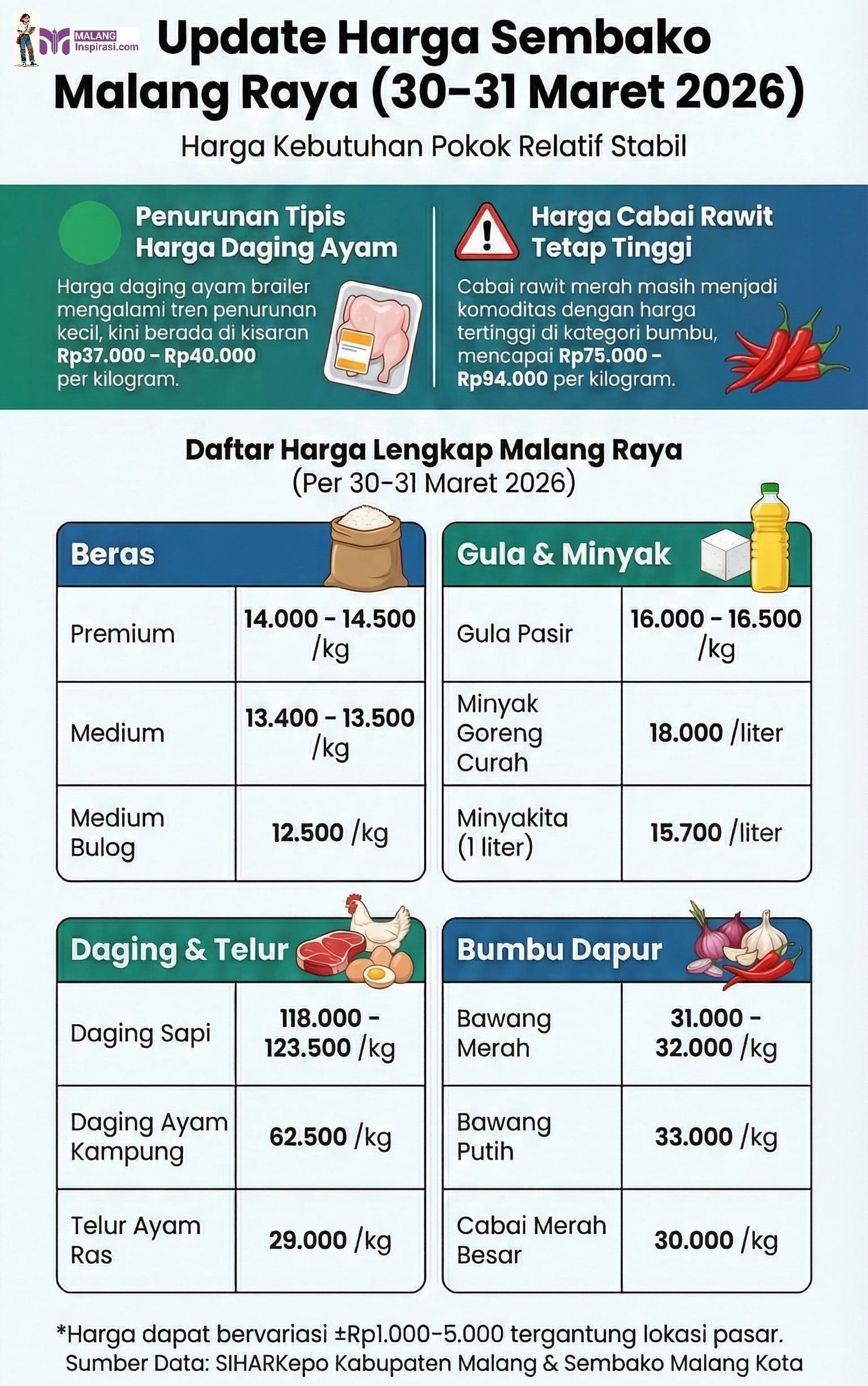 Malanginspirasi.com – Harga rata-rata kebutuhan pokok atau sembako di wilayah Malang Raya relatif stabil menjelang akhir Maret 2026. Meski demikian, harga cabai rawit masih bertahan di level tinggi, sementara beberapa komoditas seperti daging ayam potong justru mengalami penurunan kecil di sebagian kecamatan.