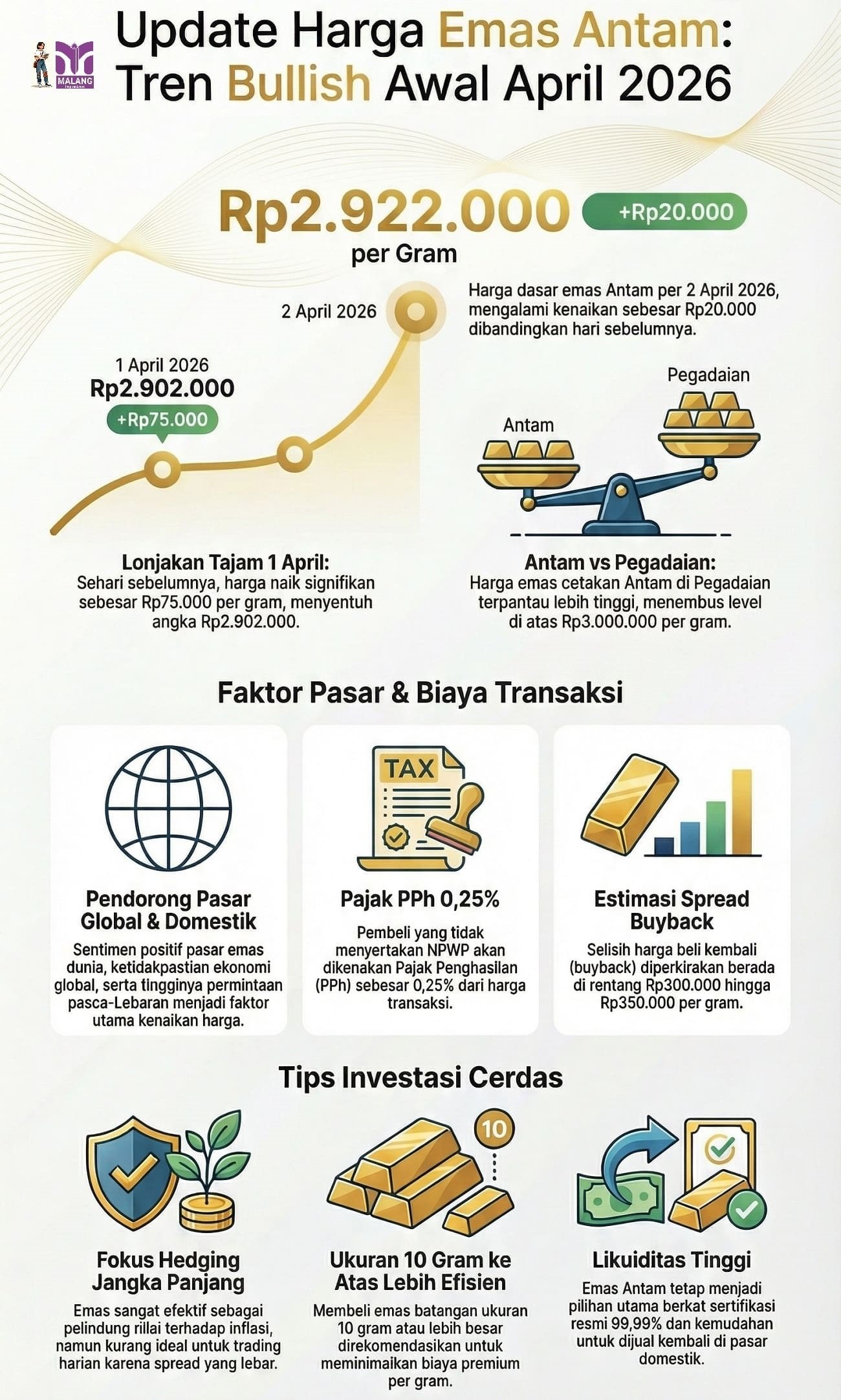Malanginspirasi.com – Harga jual emas batangan produksi PT Aneka Tambang Tbk (Antam) melalui PT Logam Mulia naik Rp20.000 per gram pada hari ini, Kamis pagi, 2 April 2026. Harga terbaru per gram tercatat Rp2.922.000, naik dari Rp2.902.000 yang berlaku sehari sebelumnya.