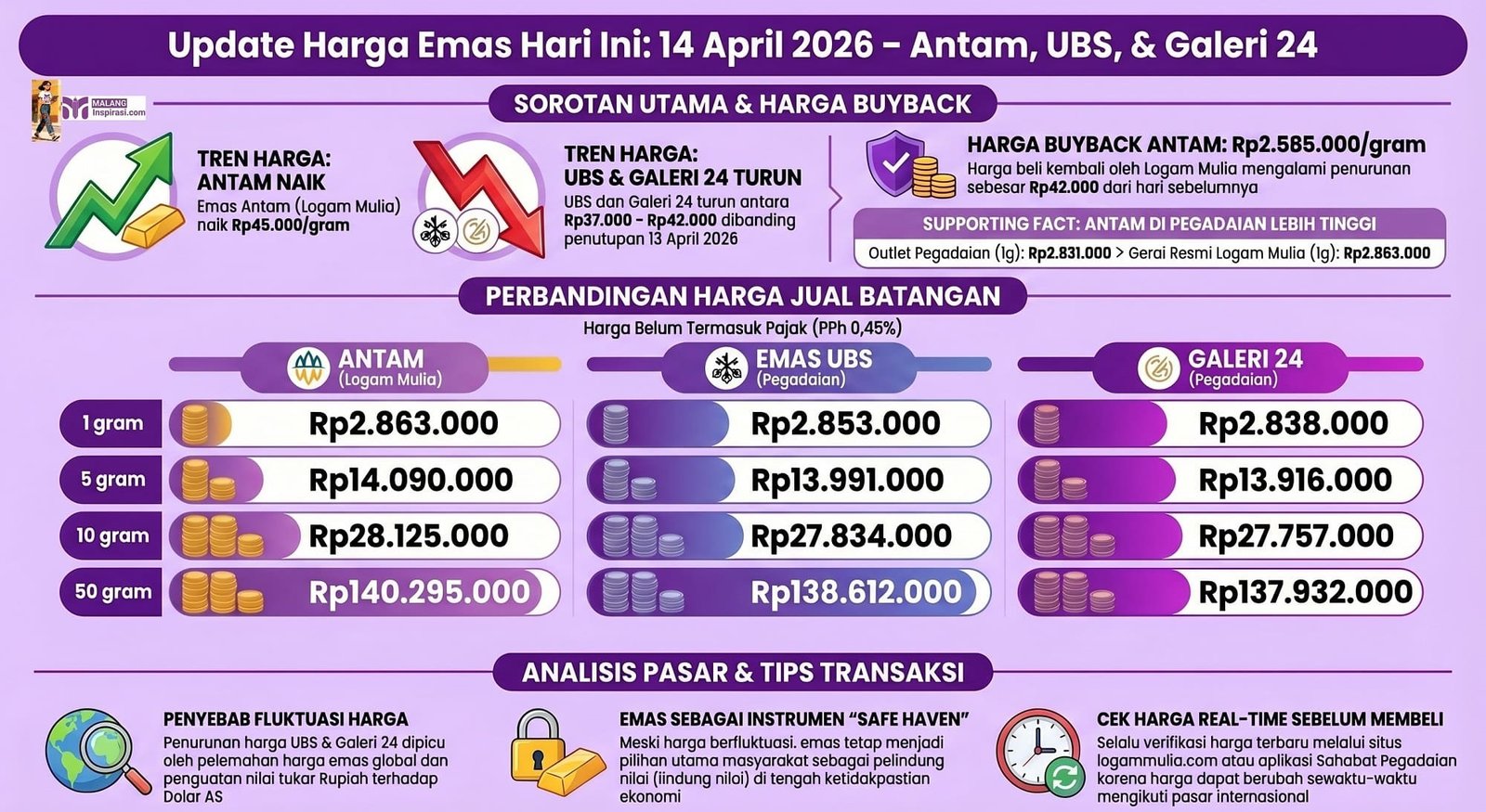 Malanginspirasi.com – Harga emas Antam, UBS, dan Galeri 24 mengalami fluktuasi pada hari ini, Selasa, 14 April 2026, seiring pergerakan harga emas dunia dan nilai tukar rupiah.