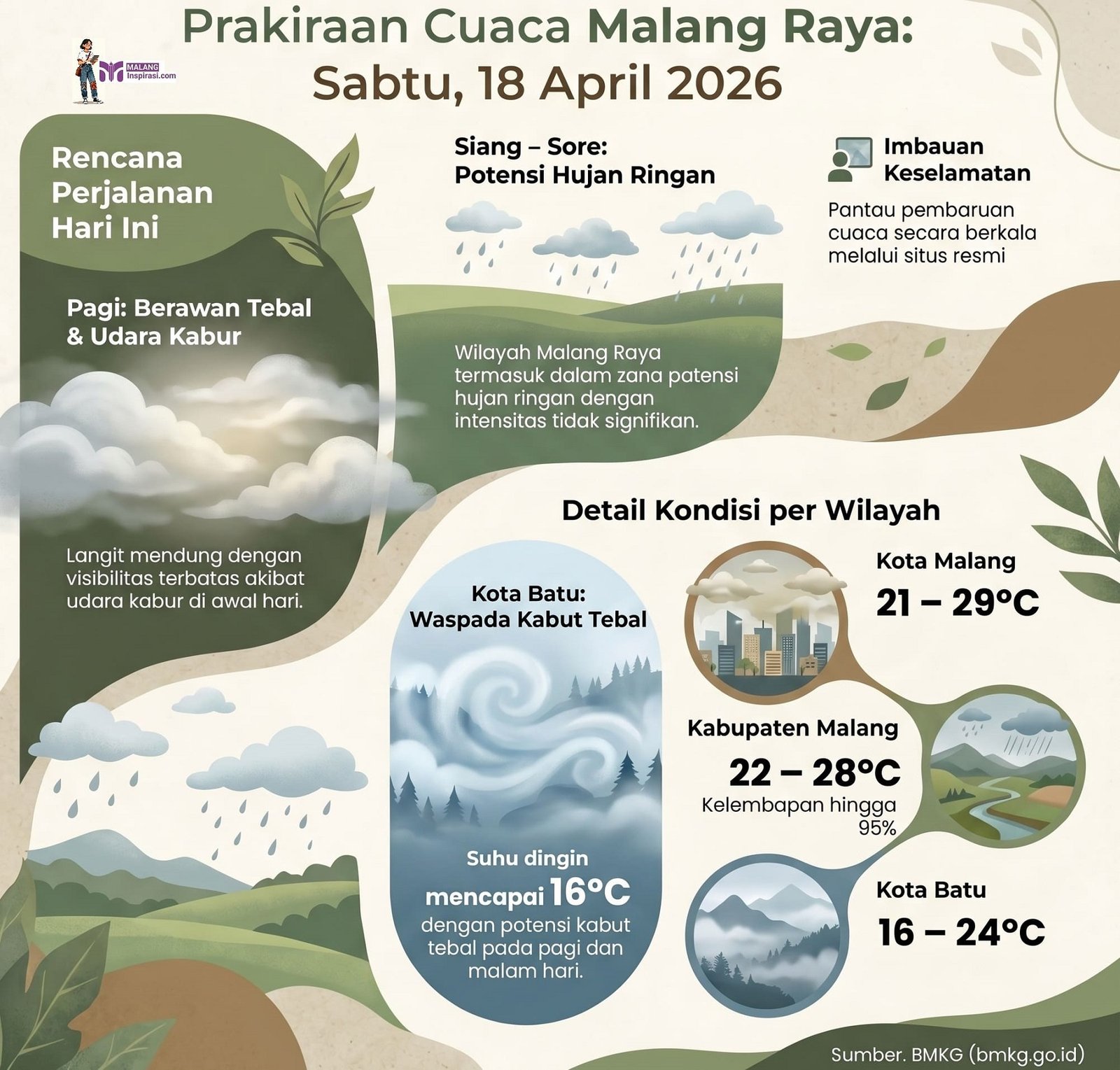 Malanginspirasi.com – Prakiraan cuaca di Wilayah Malang Raya (Kota Malang, Kabupaten Malang, dan Kota Batu) harin ini, Sabtu, 18 April 2026, langit mendung dan visibilitas terbatas akibat udara kabur.
