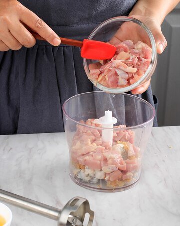 - Blender bahan utama: Haluskan daging ayam, udang, dan bawang putih menggunakan blender hingga teksturnya lembut.