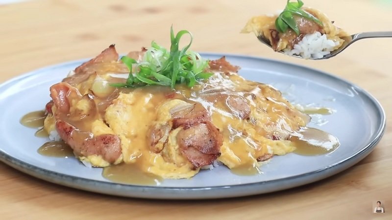 - Sajian telur diatas nasi dan disiram dengan saus.