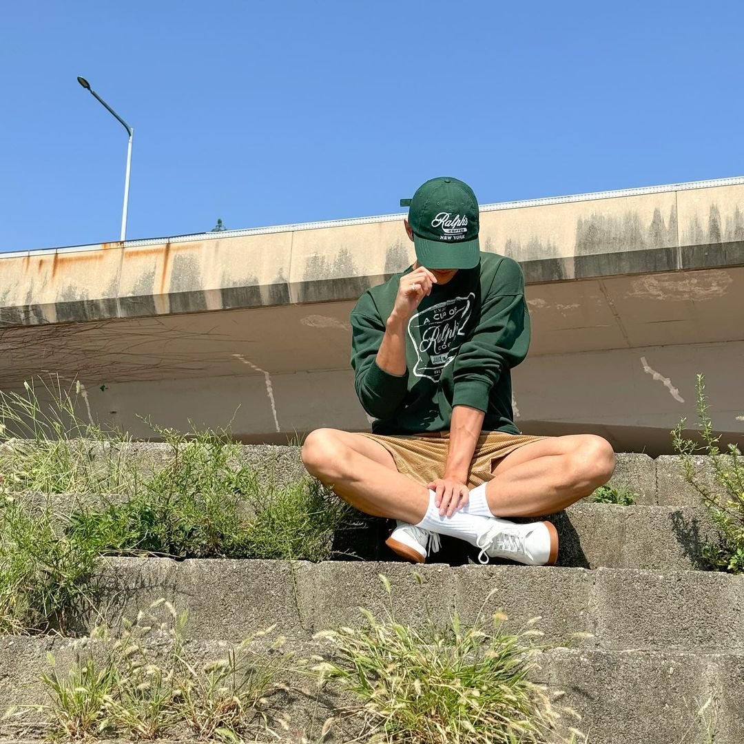 DK SEVENTEEN mengenakan sweatshirt oversized dipadukan dengan celana pendek dan topi baseball, menciptakan gaya casual yang preppy dan nyaman, cocok untuk cuaca santai atau aktivitas outdoor. Pilihan sepatu putih dengan kaos kaki putih menjadi statement dari outfit ini.