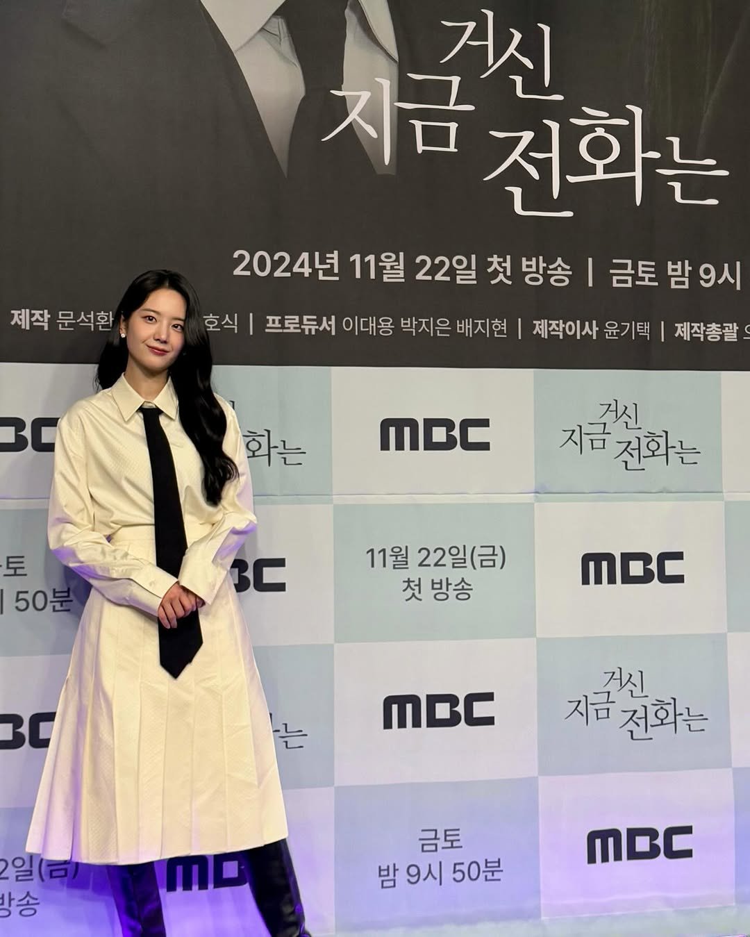 Jang Gyuri menghadirkan gaya yang terinspirasi dari seragam sekolah dengan kemeja putih, rok plisket putih, dasi hitam, dan sepatu boots tinggi. Gaya ini cocok untuk acara seperti sesi foto, meeting formal, atau acara bertema retro.