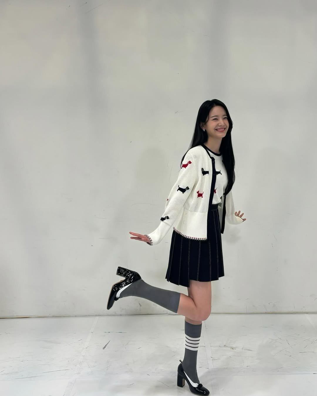 Jang Gyuri menunjukkan sisi playful dalam gaya ini dengan mengenakan cardigan bermotif lucu yang dipadukan dengan rok mini lipit, kaos kaki panjang, dan sepatu block heels.