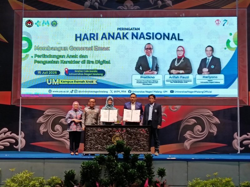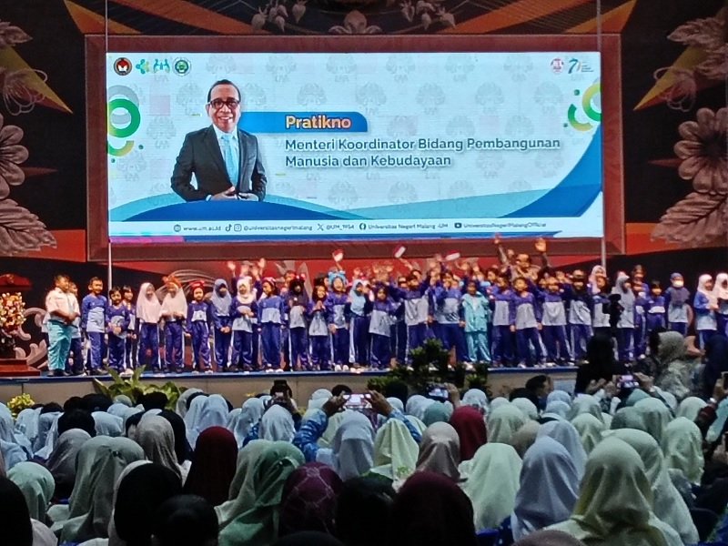 Malanginspirasi.com – Dua menteri Kabinet Merah Putih hadir dalam peringatan Hari Anak Nasional (HAN) 2025 yang diselenggarakan di Universitas Negeri Malang (UM), Selasa (15/7/2025). Keduanya adalah Menteri Koordinator Pembangunan Manusia dan Kebudayaan (Menko PMK) Pratikno dan Menteri Pemberdayaan Perempuan dan Perlindungan Anak (PPPA) Arifah Fauzi.