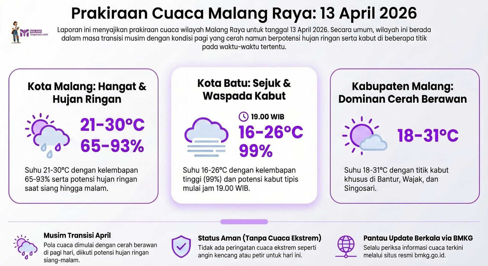Malanginspirasi.com – Cuaca di wilayah Malang Raya (Kota Malang, Kabupaten Malang, dan Kota Batu) diprakirakan cerah berawan berawan hari ini, Senin (13/4/2026) pagi, dengan potensi hujan ringan hingga sedang mulai siang hingga malam hari.