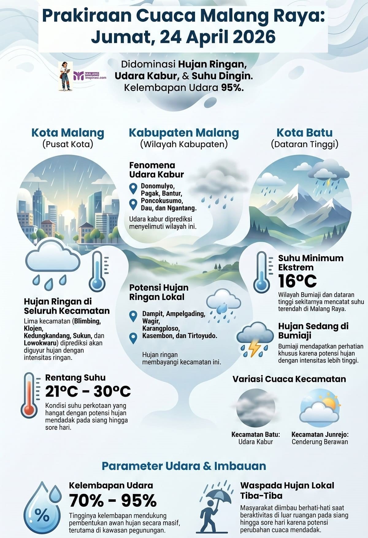 Malanginspirasi.com – Badan Meteorologi, Klimatologi, dan Geofisika (BMKG) merilis prakiraan cuaca untuk wilayah Malang Raya pada hari ini, Jumat, 24 April 2026. Secara umum, kondisi cuaca diprediksi didominasi oleh potensi hujan ringan, kondisi berawan, serta fenomena udara kabur di berbagai titik, dengan variasi suhu yang signifikan antara Kota Malang, Kabupaten Malang, dan Kota Batu.