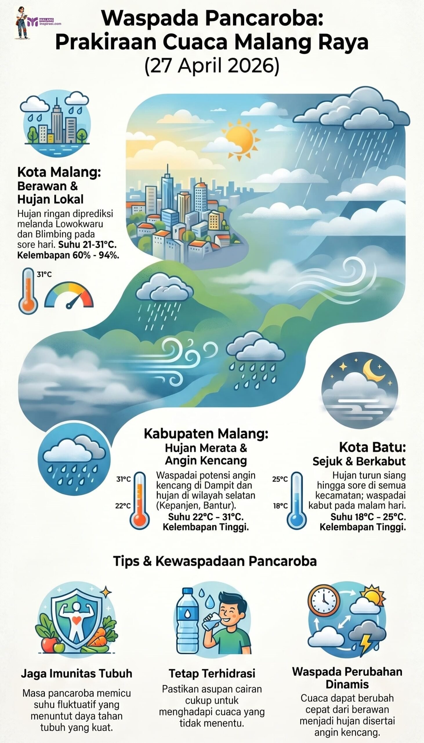 Malanginspirasi.com – Badan Meteorologi, Klimatologi, dan Geofisika (BMKG) memprakirakan kondisi cuaca di wilayah Malang Raya akan didominasi oleh langit berawan dengan potensi hujan lokal pada hari ini, Senin (27/4/2026).