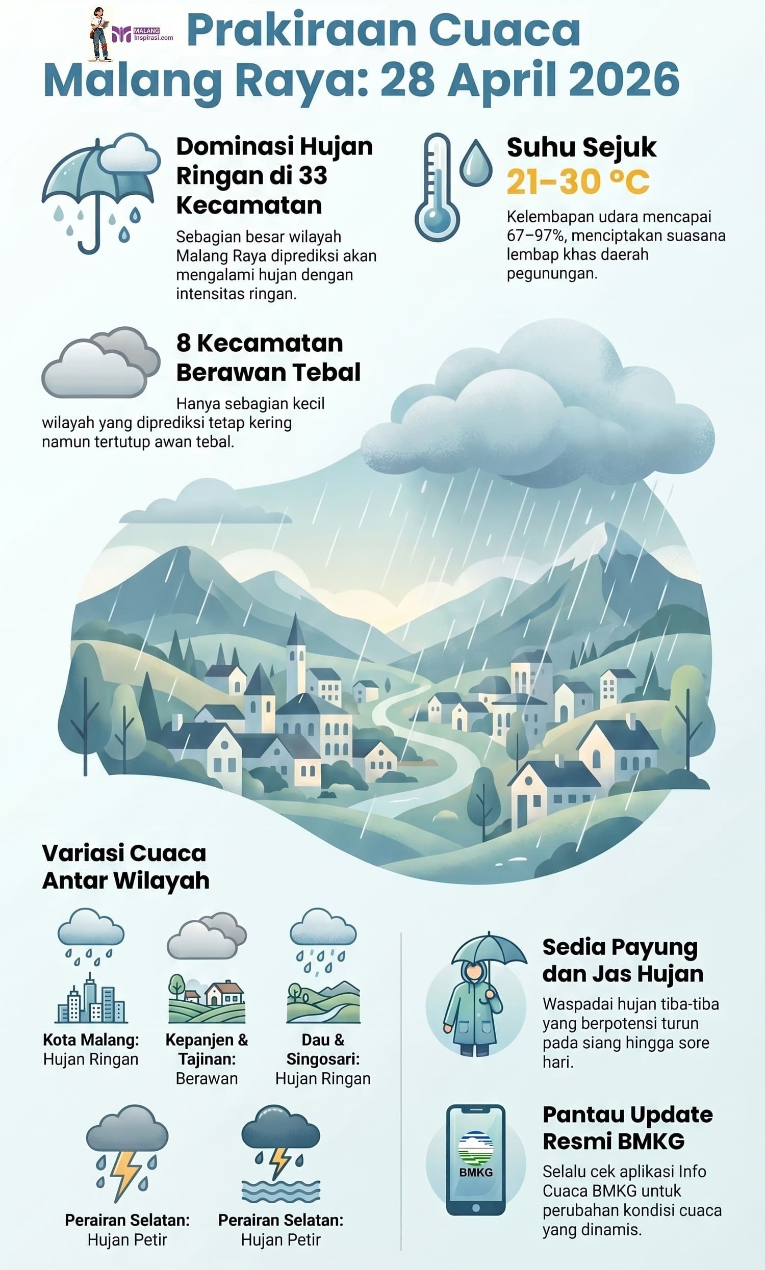 Malanginspirasi.com – Cuaca di wilayah Malang Raya pada hari ini, Selasa (28/4/2026) didominasi berawan tebal disertai hujan ringan di sebagian besar kecamatan. Badan Meteorologi, Klimatologi, dan Geofisika (BMKG) mencatat sedikitnya 33 kecamatan mengalami hujan ringan, sementara 8 kecamatan lainnya berawan.