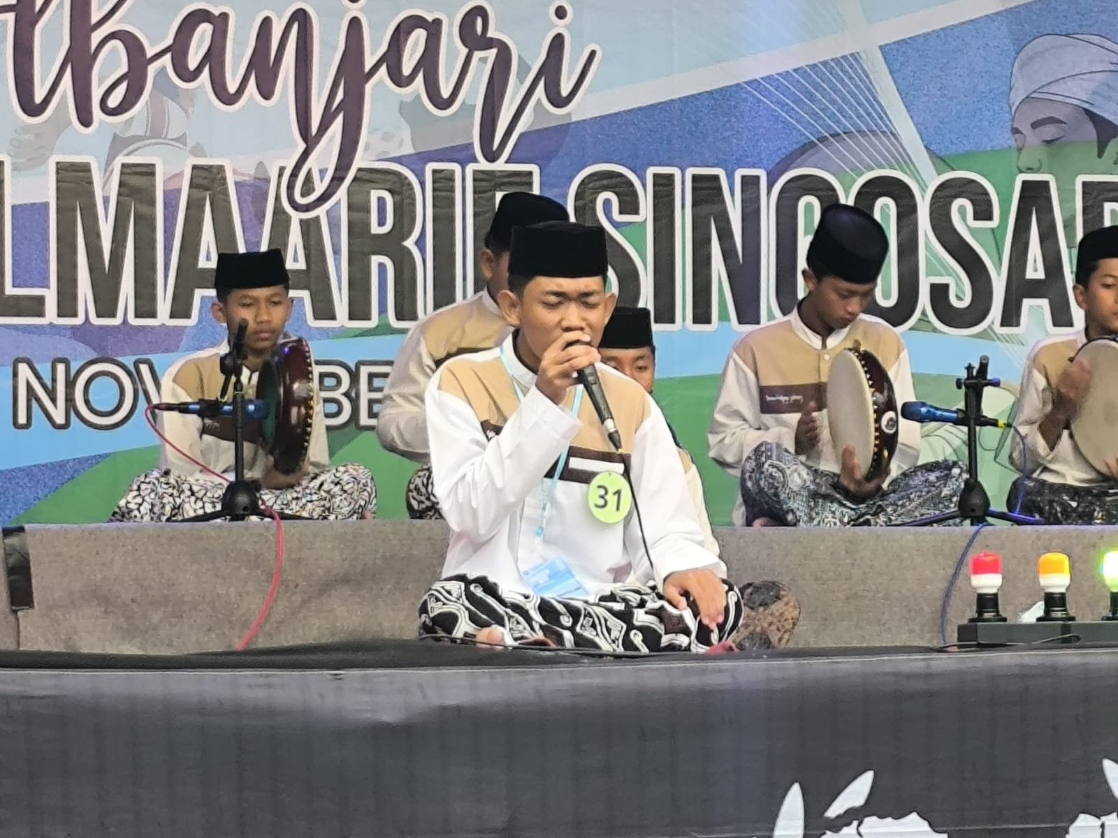 Salah satunya berasal dari MTs Almaarif Singosari yang tampil penuh penghayatan di tengah suasana hujan gerimis menjelang waktu Asar.