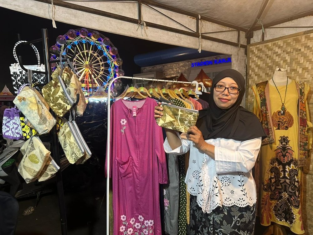 “Ada ecoprint dari daun daunan dan bunga bungaan. Ada yang ditumbuk, ada yang di steam. Kalau baju muslimah itu lebih ke bordir dan sulam. Ada juga kain tenun, songket, rajut, sampai gantungan STNK dari bahan kulit,” ungkap Ayu.