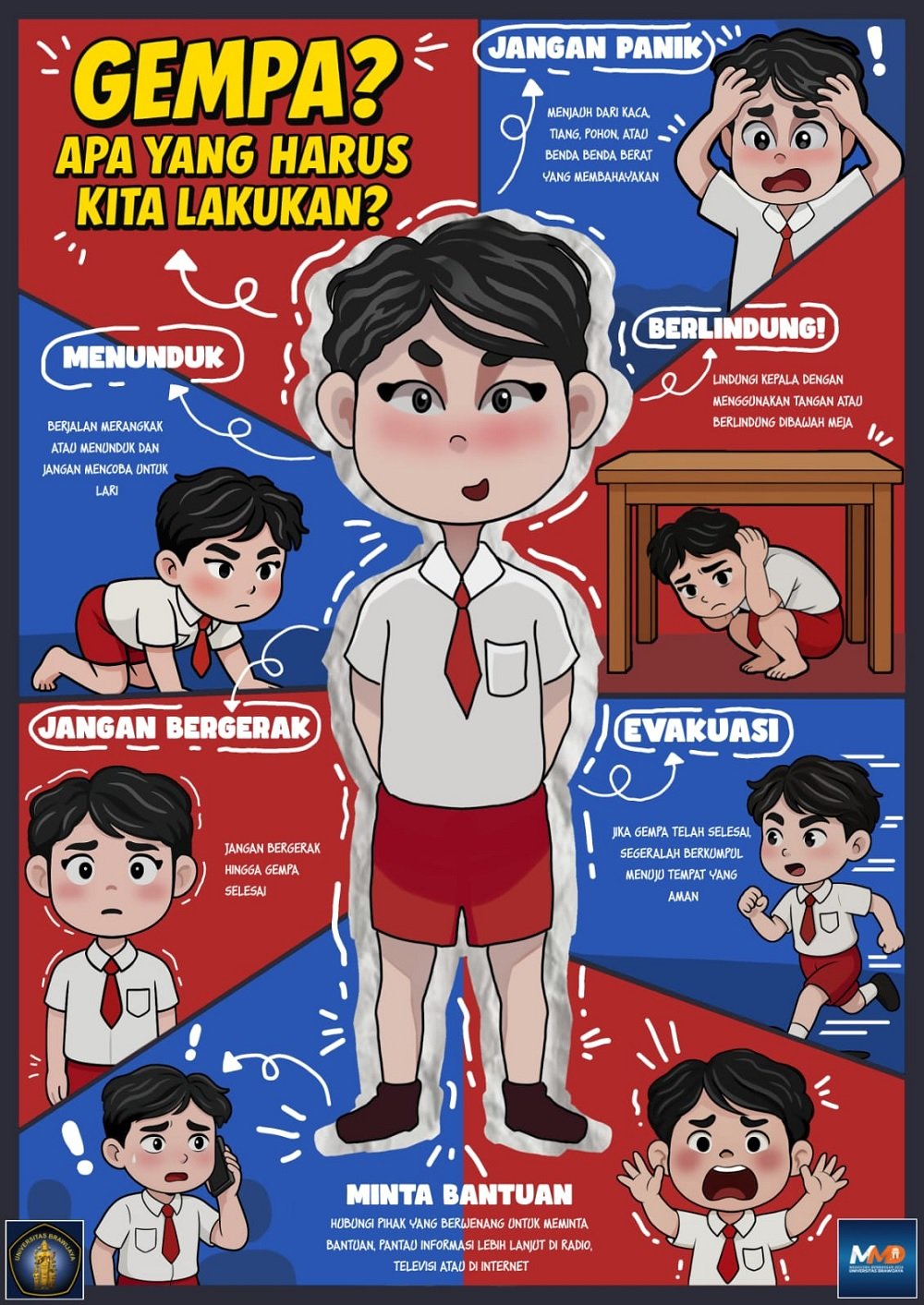 Tak hanya komik, Fauzan juga membuat poster edukasi kebencanaan hasil karyanya untuk pihak sekolah. Poster ini memuat langkah-langkah penyelamatan saat gempa di berbagai situasi, baik di kelas, rumah, maupun ruang publik.