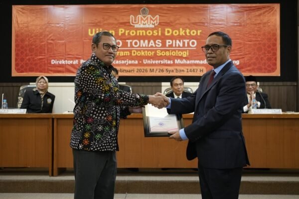 Malanginspirasi.com – Julio Tomas Pinto raih gelar doktor dengan mengulas transformasi militer dari kekuatan perjuangan menuju tentara profesional dalam Ujian Promosi Doktor di Aula GKB 4 Universitas Muhammadiyah Malang (UMM), Sabtu (14/2/2026).