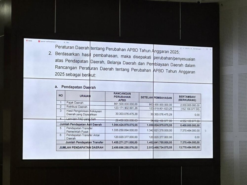 Hasil pembahasan rapat paripurna ditetapkan bahwa pendapatan daerah dalam Rancangan Peraturan Daerah tentang Perubahan APBD Tahun Anggaran 2025 mengalami kenaikan.