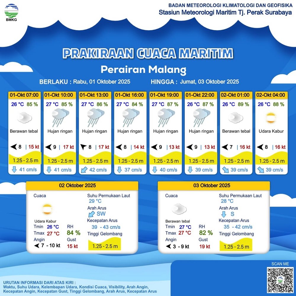 Sementara itu, untuk wilayah perairan Malang, BMKG memperingatkan adanya hujan ringan dengan kecepatan angin dari arah tenggara mencapai 16 knot, dan sesekali hembusan angin kencang hingga 23 knot.