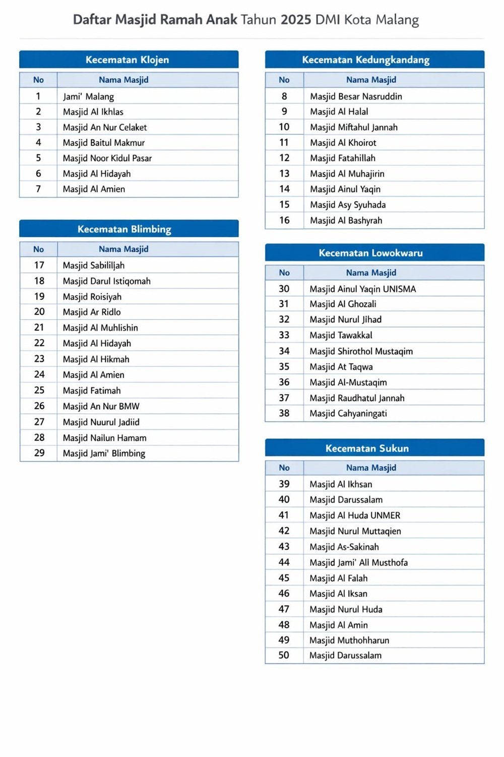 Malanginspirasi.com – Dewan Masjid Indonesia (DMI) Kota Malang secara resmi mendeklarasikan 50 Masjid Ramah Anak pada Minggu (21/12/2025) bertempat di Masjid Al-Huda Universitas Merdeka (UNMER).