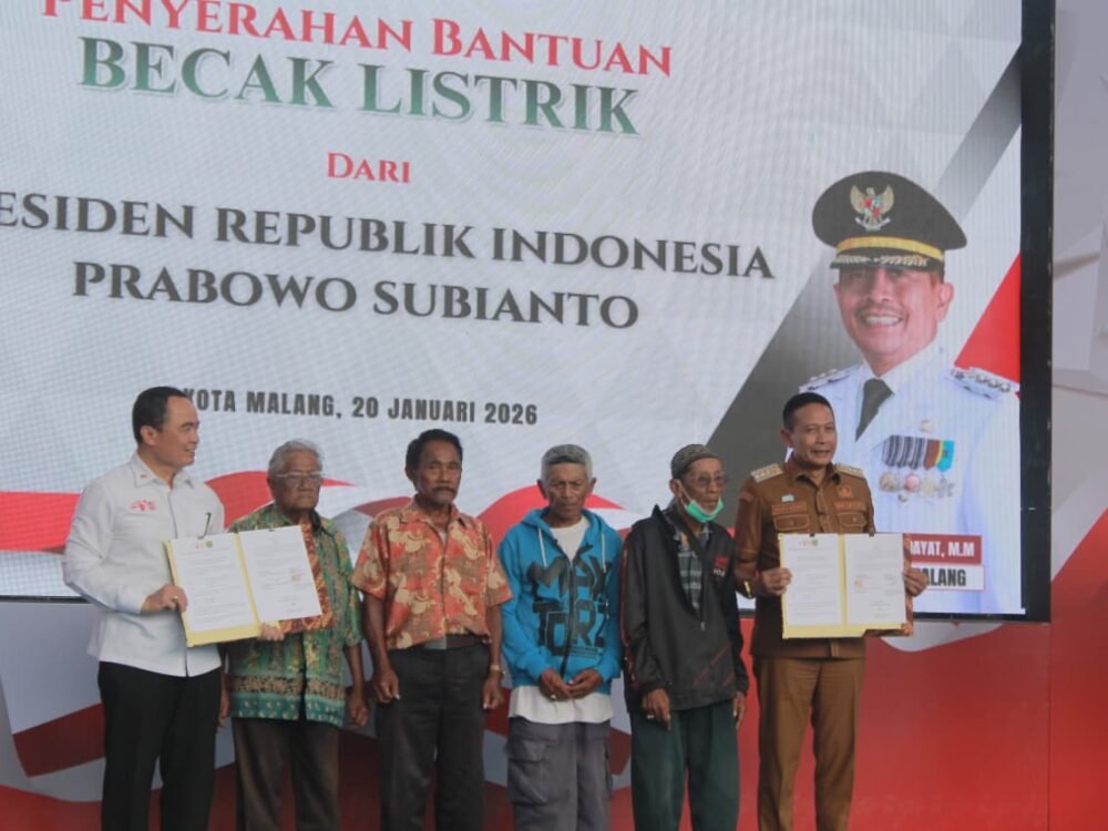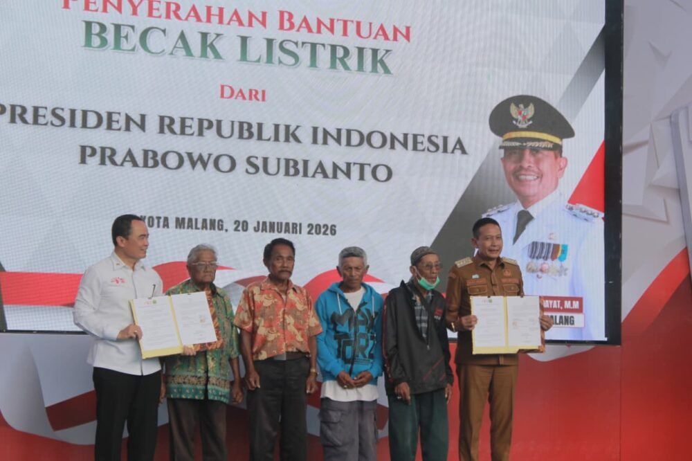 Malanginspirasi.com – Pemerintah Kota Malang bersama Yayasan Gerakan Solidaritas Nasional (GSN) menyelenggarakan seremoni penyerahan bantuan becak listrik dari Presiden Republik Indonesia, Prabowo Subianto, pada Selasa (20/1/2026), bertempat di Halaman Balai Kota Malang.