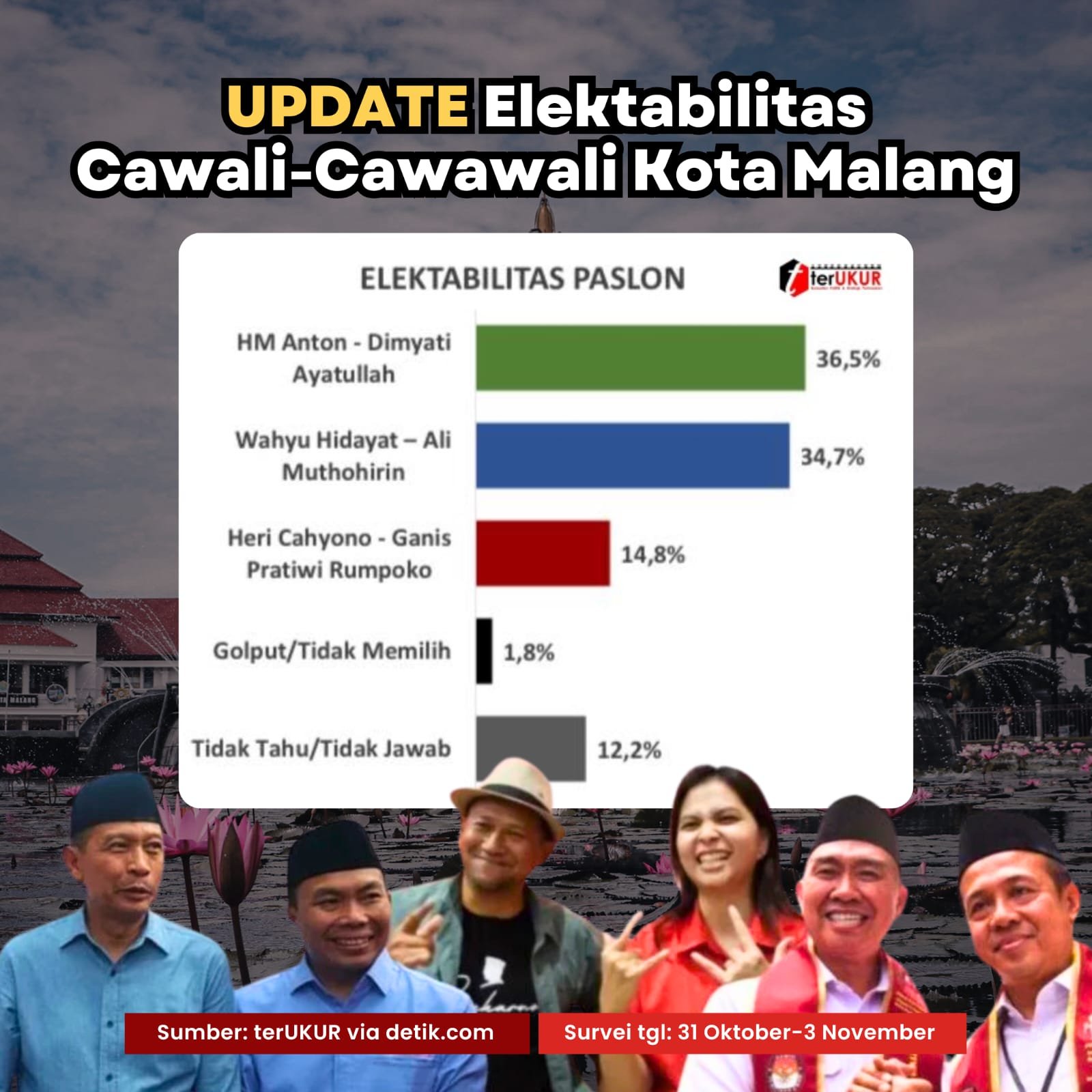 Malanginspirasi.com – Elektabilitas pasangan calon Wali Kota dan Wakil Wali Kota Malang Wahyu Hidayat dan Ali Muthohirin melejit tajam atau naik signifikan jelang pencoblosan Pilkada 2024 pada 27 November. Terbaru, elektabilitas paslon nomor urut 1 itu mencapai 34,7 persen berdasarkan hasil survei terukur.