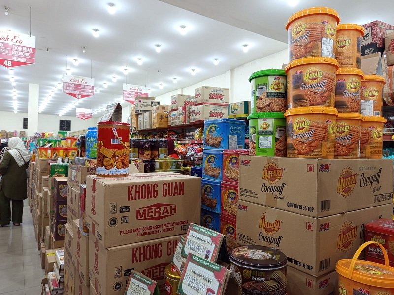 Enak Eco dipenuhi dengan jejeran kaleng berisi wafer roll, cookies, atau biskuit beserta tumpukan kardus air mineral kemasan ekonomis hingga minuman kemasan berbagai rasa.