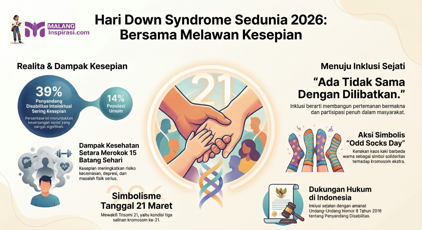 Malanginspirasi.com – Masyarakat internasional, termasuk Indonesia, memperingati Hari Down Syndrome Sedunia (World Down Syndrome Day/WDSD) hari ini, 21 Maret 2026. Tema resmi tahun ini, “Together Against Loneliness” atau “Bersama Melawan Kesepian”, menyoroti masalah kesepian yang dialami secara tidak proporsional oleh penyandang sindrom Down dan disabilitas intelektual lainnya, serta keluarga mereka. Peringatan ini bukan sekadar seremonial belaka. Tetapi juga ajakan global untuk mewujudkan inklusi sejati agar setiap individu merasa terhubung, dihargai, dan memiliki rasa memiliki.