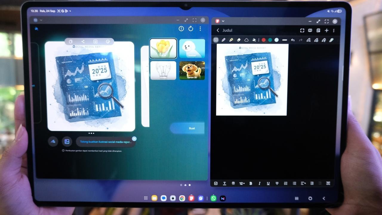 Tablet ini dirancang untuk menemani hari-hari produktif sekaligus kreatif berkat fitur-fitur Galaxy AI. Dengan Writing Assist, kamu bisa menulis email atau laporan dengan nada yang pas tanpa harus bolak-balik mengedit. Ada pula Drawing Assist membantu mengubah coretan menjadi ilustrasi yang bisa langsung dipindahkan ke Samsung Notes untuk jadi pijakan ide, sempurna untuk sesi brainstorming, perencanaan visual, atau sekadar menuangkan kreativitas.